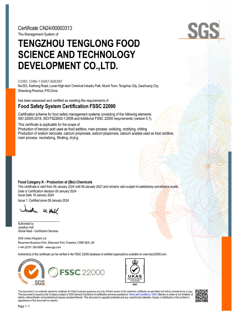 滕州市騰龍食品科技發(fā)展有限公司坐落在山東省滕州市木石鎮(zhèn)魯南高科技化工園區(qū),成立于1996年,前身是滕州市騰龍化工有限責(zé)任公司,公司專(zhuān)業(yè)生產(chǎn) 苯甲酸,苯甲酸鈉,丙酸鈣,丙酸鈉和醋酸鈣等系列產(chǎn)品。